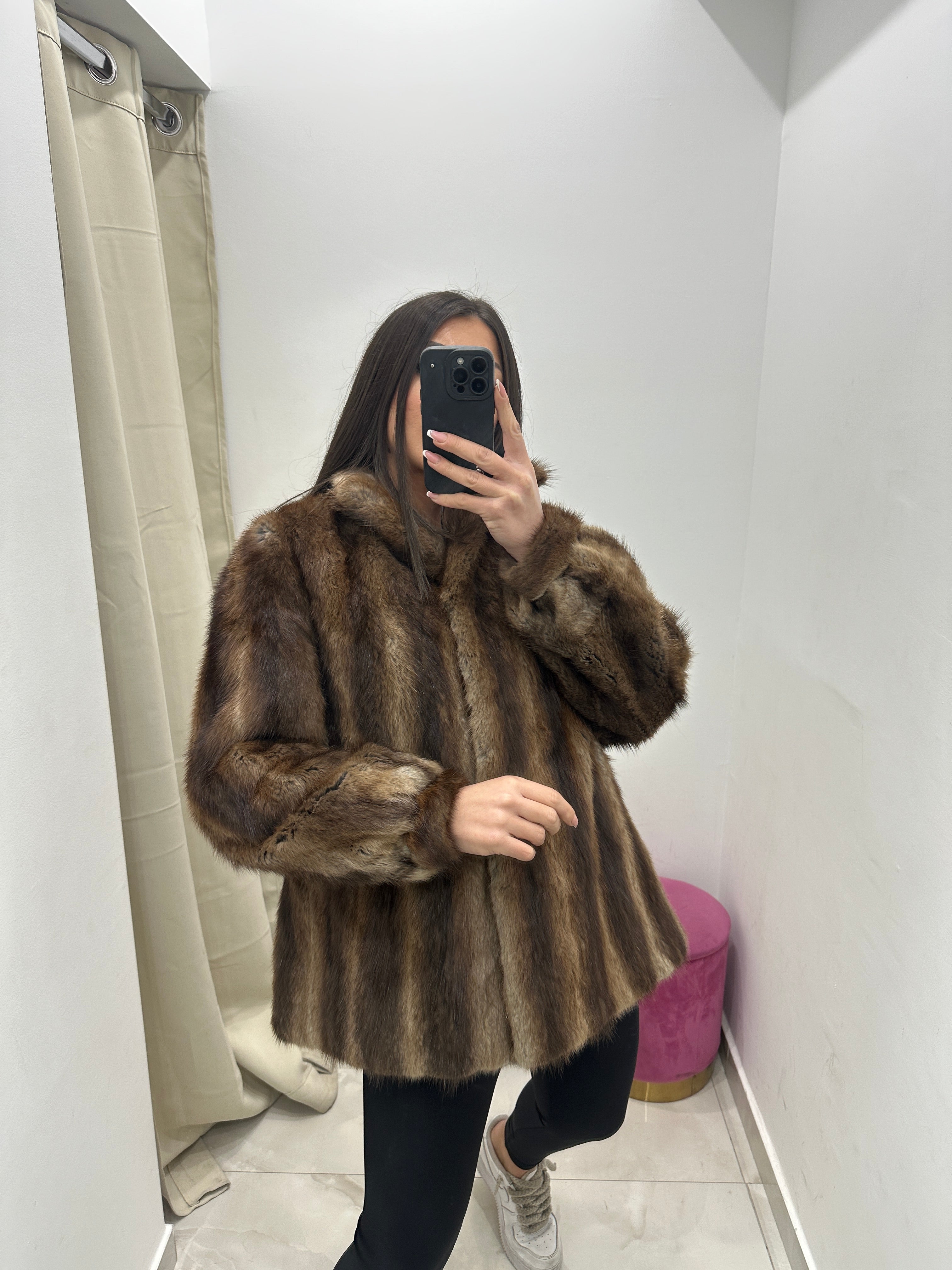 Pelliccia vera vintage bicolor marrone chiaro e marrone scuro.