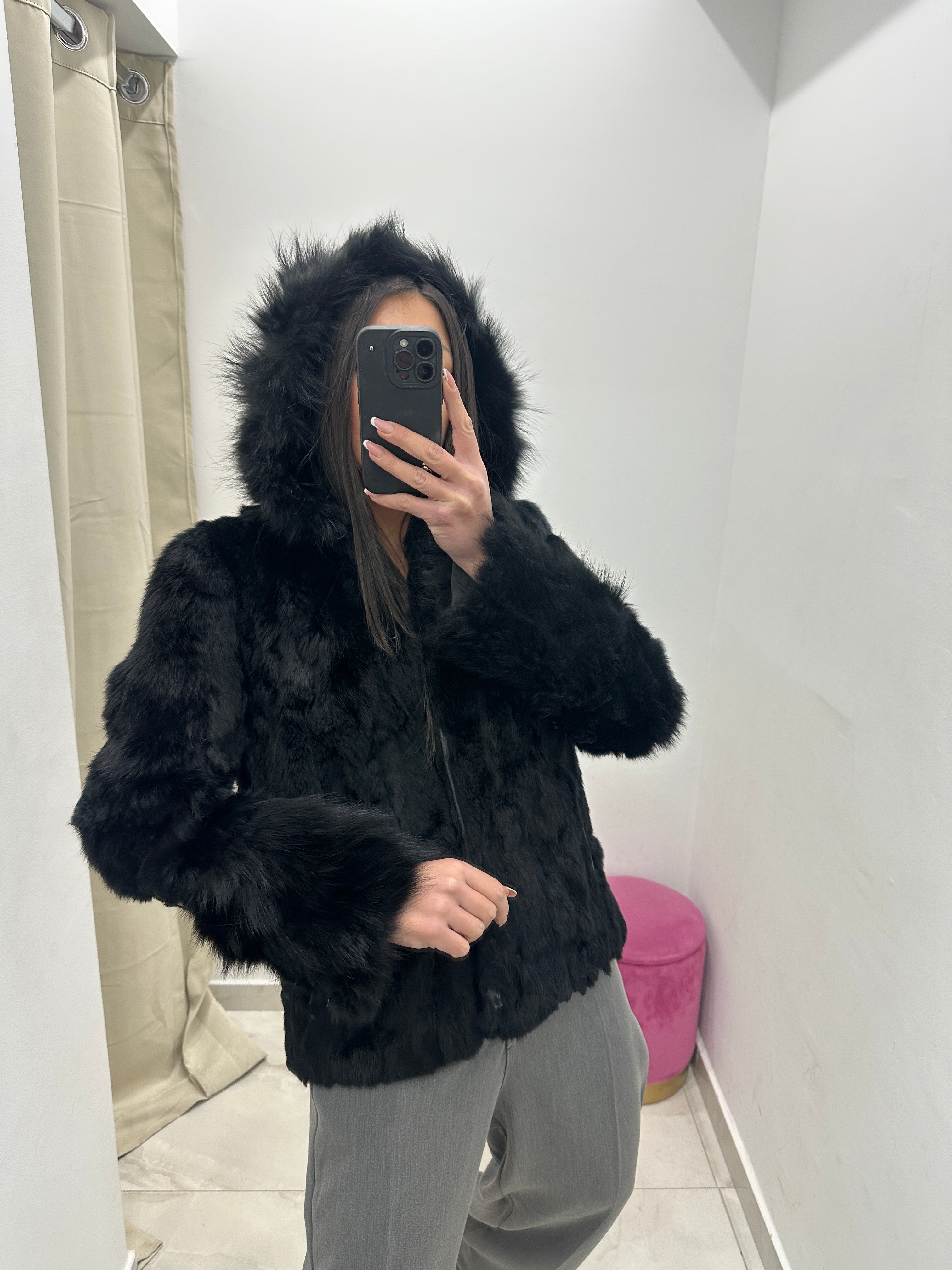 Pelliccia vera vintage in promo nera con cappuccio