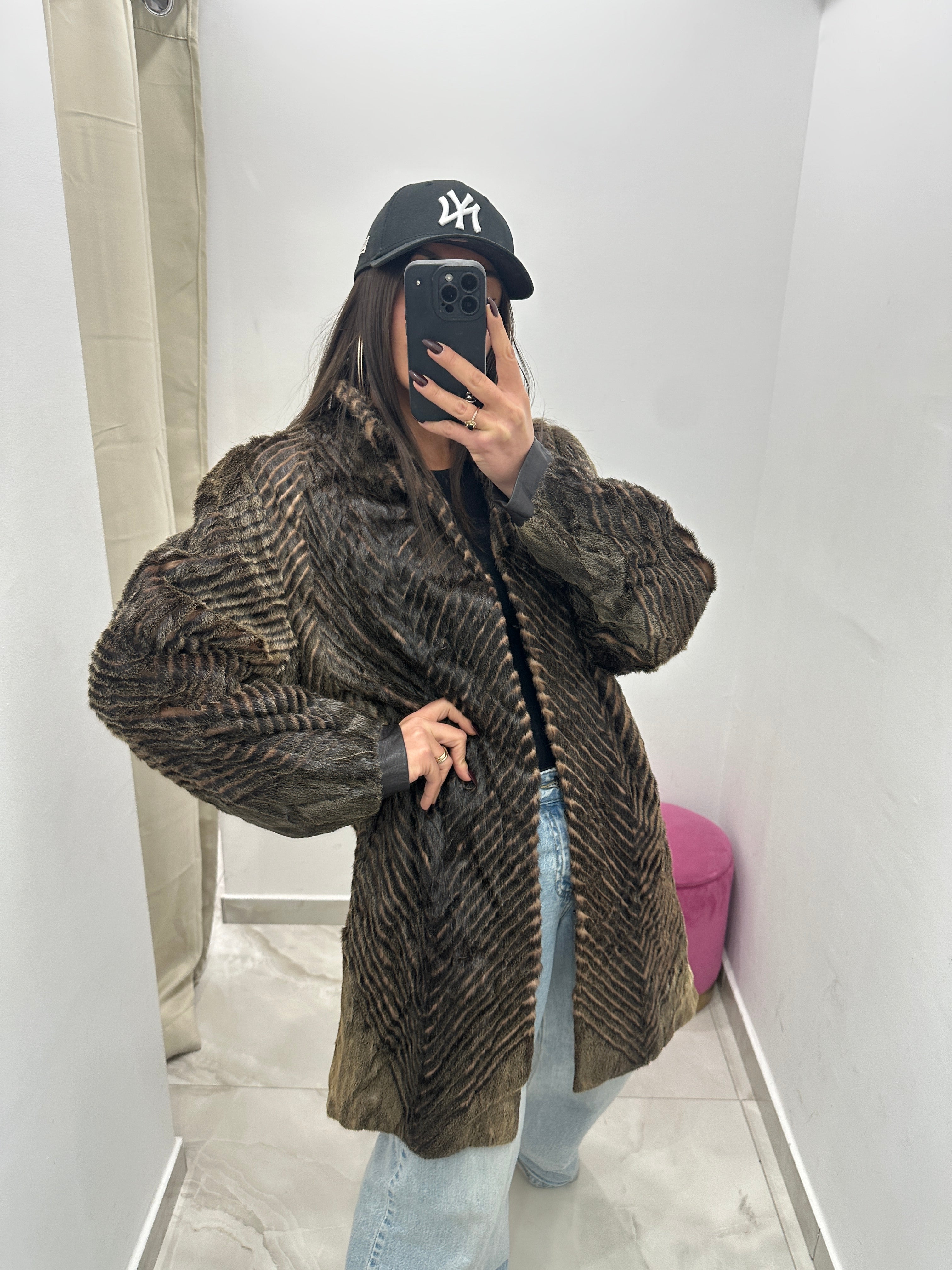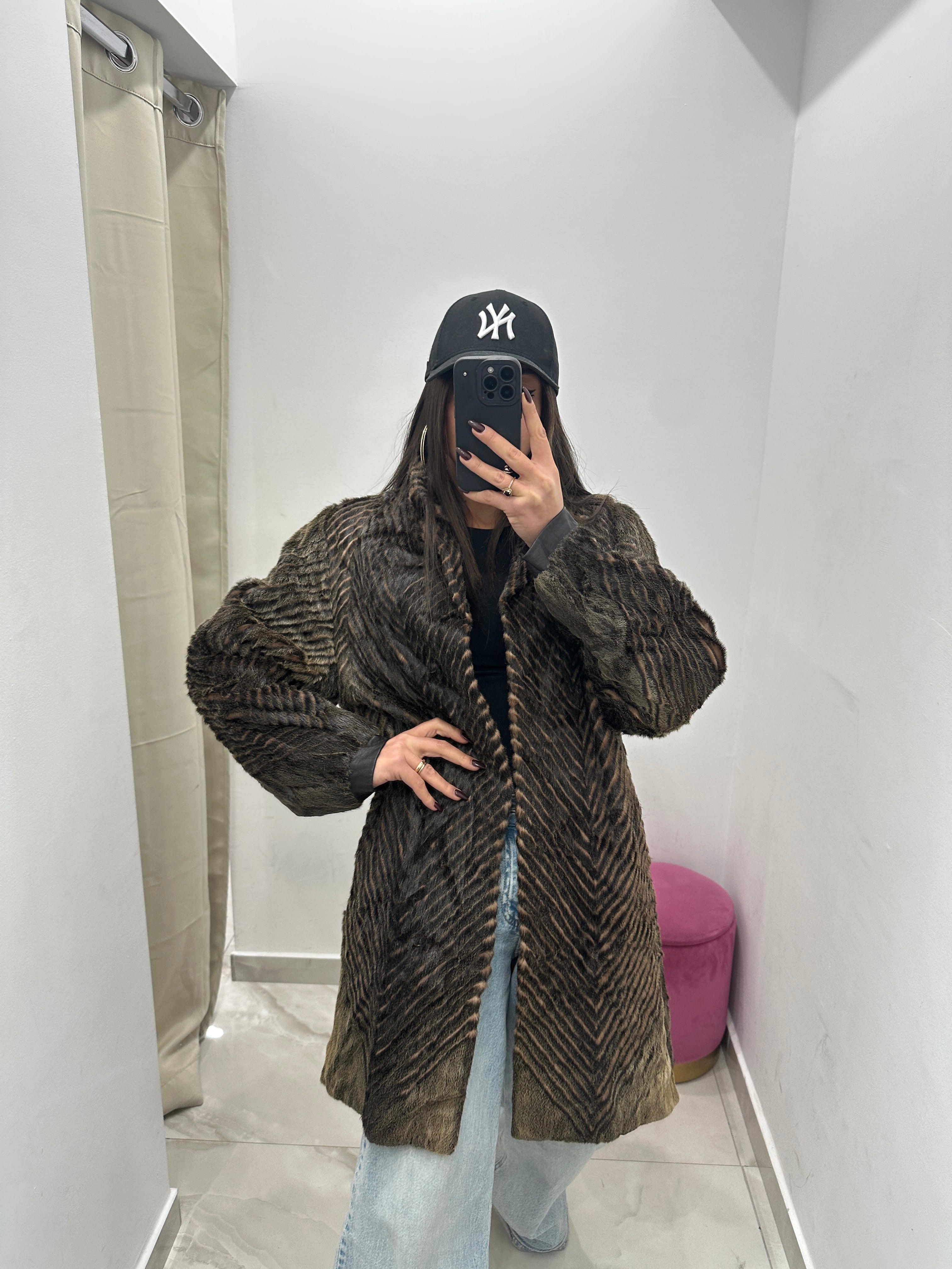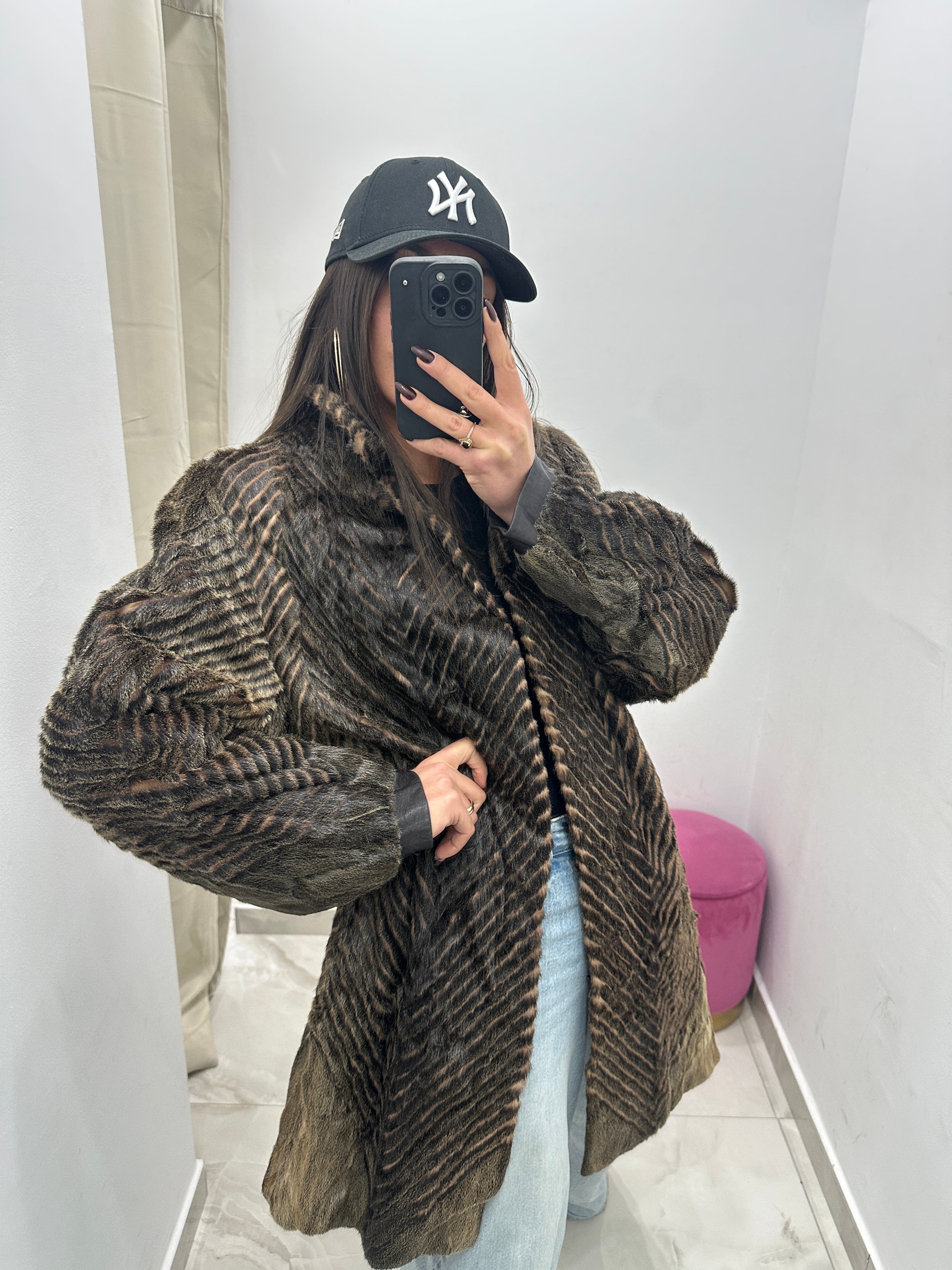 Pelliccia vera vintage animalier con strisce a spina marrone e beige.
