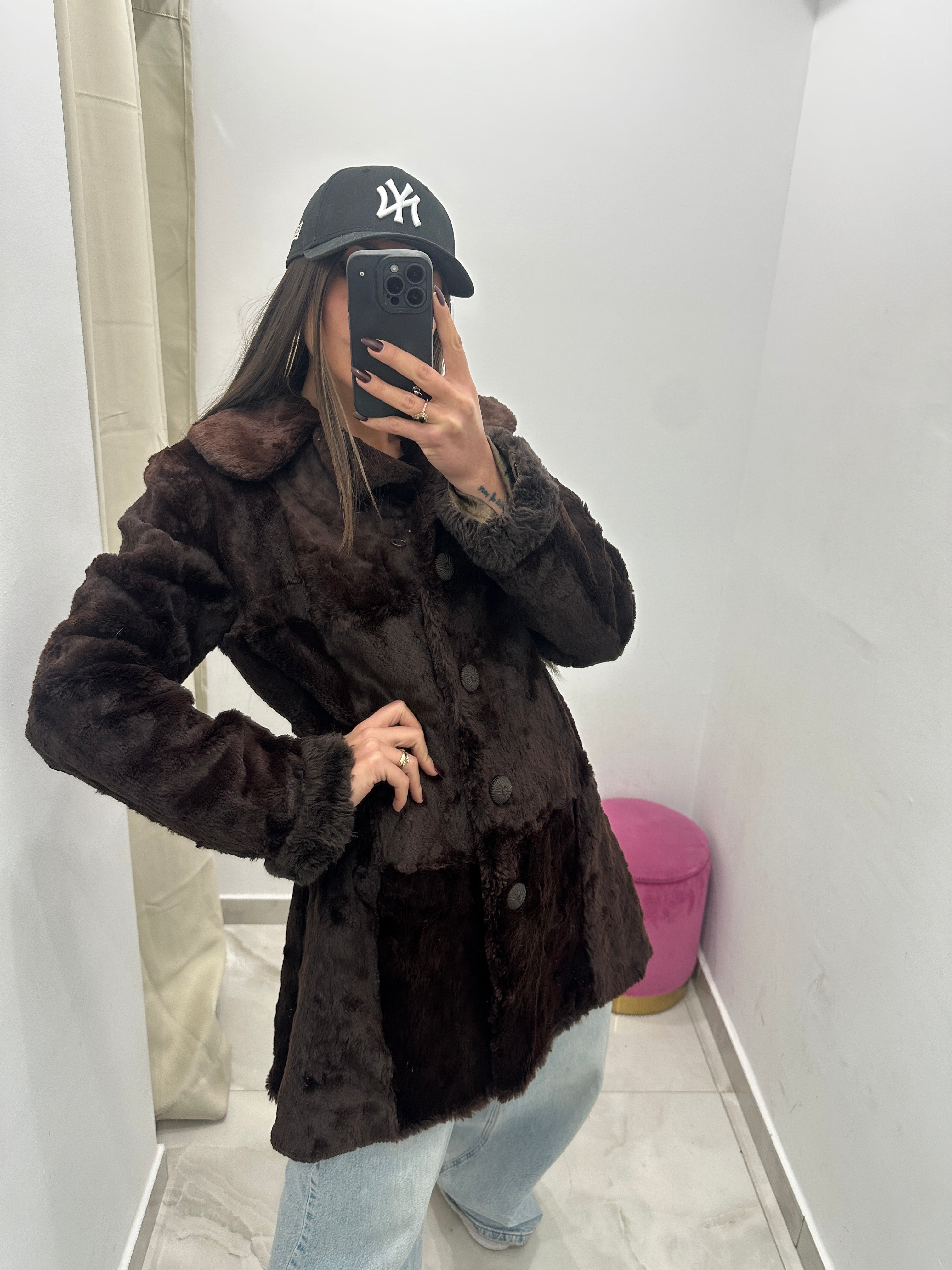 Pelliccia vera vintage marrone scuro con chiusura doppio petto, con particolare cucitura a quadri.